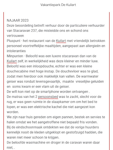 Read moreJULI 2024 Dit review betreft uitsluitend de verhuur van vakantiehuizen. Wij hebben voorheen 2x op camperplaatsen gestaan, die waren prima. Ook zijn wij het gehele jaar door vaste klant (stamgast), van It Skippershûs, het restaurant van de Kuilart, waarover wij ook zeer tevreden zijn, welk wel 5 sterren waard is. Wij hebben wederom, vanwege de hopelijk laatste verbouwing in ons woonhuis, een klein weekje, 5 dagen en 5 nachten, buitenshuis moeten verblijven. Gelet op onze negatieve ervaring met particuliere verhuur vorig jaar, huurden wij nu bij Vakantiepark de Kuilart zelf, maar ook deze huur werd een regelrechte ramp! Vakantiepark de Kuilart voert 5 sterren maar is dit niet waardig. Zij beweren dat zij die 5 sterren waard zijn omdat zij gemiddeld boven de 8 uit 10 scoren en daardoor lid mogen zijn van de Vakantieparken groep Ardoer. Lees je echter de reviews op internet dan zijn de meeste reviews negatief.