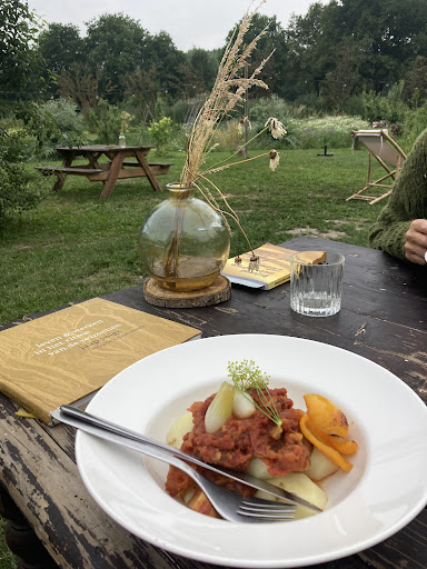 De locatie is uniek: omringd door moestuinen, bloemenvelden en een landelijke sfeer met houten hekjes en een natuurlijke inrichting. Het buitenterras, met houten tafels, strobalen en kleurrijke bloemen in vazen, nodigt uit om urenlang te genieten van een goed gesprek of een drankje. Vooral bij mooi weer is het een fantastische plek om lekker te zitten.