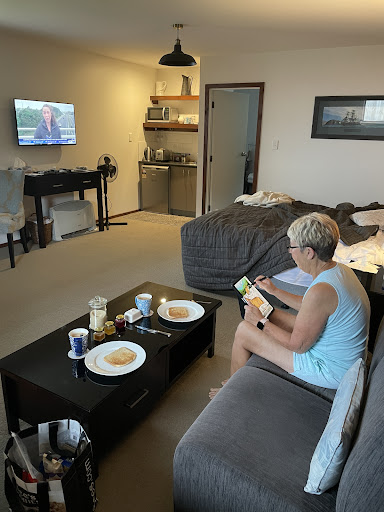 Great location, although please note the references in other reviews to the spectacular view from the breakfast room are outdated - the owners have decided not to allow guests in that area due to Covid and their small children. Entirely understandable but was an unpleasant surprise. Hopefully this will change soon. ||||The room itself was in the back of the property on the first floor, with no view, but it was comfortable enough, with a nice modern bathroom. The large first floor breakfast room was stocked with substantial continental breakfast fare. ||||Another issue with the property is the wifi/internet. The owners provide free vouchers for internet service, which say they offer 1Gig of data each, but in reality they offer about 1/10th of that, so we had to keep logging in again with new vouchers all the time. Also the Smart TV's are not hooked up to the internet, so none of the apps like Netflix or Amazon work. We got our Roku to work, but getting through a single movie took logging in with new vouchers about 6 times. Finally, the property is unable to accept credit cards or any form of internet payment, e.g. Paypal, Zelle, Venmo, etc. One of the owners suggested we go to the local bank - please note this is about the last thing someone wants to have to deal with on a holiday. We eventually did an electronic bank transfer from a NZ bank account one of us had, but this will be a problem for international visitors obviously. ||||Anyway, we still had a nice time in Kaikoura, with some great seal and dolphin watching, and I'd still recommend the area...