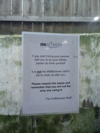 Another rude thing. Right next to the sink there is a condescending sign that says, "If you haven't brought your parents to do your dishes for you then please clean up after yourself." Again I understand it costs money to have a labor not to mention its annoying to clean up after every client's dirty dishes but there is a right way to talk to clients.