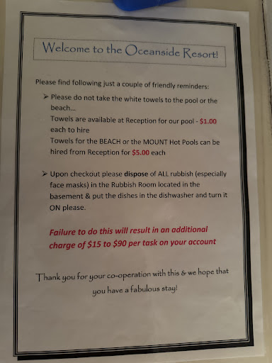 Read moreDisappointing Stay||I recently stayed at this accommodation for an overnight work trip, and unfortunately, it fell short of expectations.|Here are the issues my two colleagues and I encountered:||Late Check-In Fee: Despite thinking we were doing the polite thing and calling ahead (around 4pm) to inform of our late arrival (7.30 pm), we were surprised by being notified that there would be a $250 holding charge required from each of us. There was no follow up email to reassure that the money would be returned, even though that was what we were told on the phone once the money was paid. Not a great start.|Ocean View Disappointment: Two rooms were specifically booked as ocean-view, but the view was barely visible—a mere sliver from my 3rd floor window and my other colleague was on the bottom floor near the pool. It should be renamed "Ocean glimpse".||Room Comfort: The linen was like scratchy cardboard (felt like they'd been bleached and over scorched), pillows were flat like pancakes, and only a thin bed blanket provided (all accomodation we've stayed at in Papamoa and the Mount have had an extra blanket in the wardrobe). The even thinner bed throw does not count as an extra blanket. I had to get up in the middle of the night to turn on the heat pump for warmth. Towels are small, old and worn out.||Early Wake-Up Call: The building shook due to early morning rubbish trucks, which felt like an earthquake. Concerns about a tsunami due to the close proximity to the ocean didn’t help either.||Confusing Checkout: Despite the stated 8.30 am reception opening time, we arrived at 9.30 am to find nobody there—just an upside-down key drop box (which we saw another guest rattle by accident and several room keys fell out). We even called out and waited but the desk remained unattended. The only person around was the contracted cleaner who was vacuuming the footpath and driveway directly outside the reception.||Odd Trash Policy: The sign requiring guests to take their own trash upon checkout or else there would be added charges seemed unnecessary, especially after just one night’s stay. (In which I only used one tea bag and a complimentary oat milk sachet).|Pool Closure: We attempted to use the pool at 9.30 pm (closing time listed as 10 pm), but it was already covered and inaccessible.||Additional towel charges: There’s an extra $5 charge if you want to take a towel to the hot pools. Unfortunately, we arrived at 7.30 pm, and the reception was closed. Luckily I'd brought a towel from home, but then all three of us had to use it at the hot pools as we were afraid of incurring whatever fee was attached to taking a room towel to the hot pools.||Sky Digital: Had sky sports channels but nothing else, other than freeview.|Even though the rooms are very spacious, the dated decor (especially the weird mirror headboard) added to the overall disappointment.|Glad that this was a paid work trip because I would not pay to stay here. (except for handing over $250 of my own money as a "holding fee" for our late check in, which was then given back the next morning).||There is so much negative signage around the place stating rules and extra charge fees that could be avoided if it was all stated on the website so that people knew what to expect. (Design tip- just stick to one font when making your signs and don't bother with the dated 90's microsoft word border. You can find free templates on Canva that are much more visually appealing).||I hope management uses the money from all those extra charges for towels to buy fresh new fluffy towels and the money from rubbish fines to pay for a trash chute for future guests' comfort so they don't have to carry their one lone teabag down to the rubbish room in the basement when they check out.||Will definitely make sure work does not book me or my...