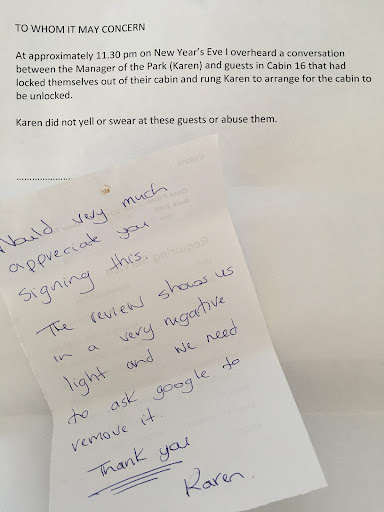 Read moreThanks for the email this morning inviting us to leave a review. Just a quick recap for others, this campsite was lovely, they have good amenities but management are in a bubble of righteousness and cannot see how rudely they treated other guests staying in a nearby cabin to us, instead they tried to make us sign a false statement that they saying didn't do anything wrong which we highly disagreed with as Karen was incredibly rude and was yelling at these guests (the purpose of letter was to have the guests bad review removed from Google). I hope you guys find some humility and call these guest and apologise for how you spoke to them. They were locked out due to a fault with your door, yes they were a bit drunk (it was New Years Eve) but they were not rude or aggressive, they were apologetic and just wanted to get back inside after your door malfunctioned and locked them out. I'm sure having to get up at 11.30pm to unlock the door was an inconvenience but it is your job and the after hours number is there for these exact situations. The letter you left us (pictured below) and stopping us at check out made us feel very uncomfortable and kind of...