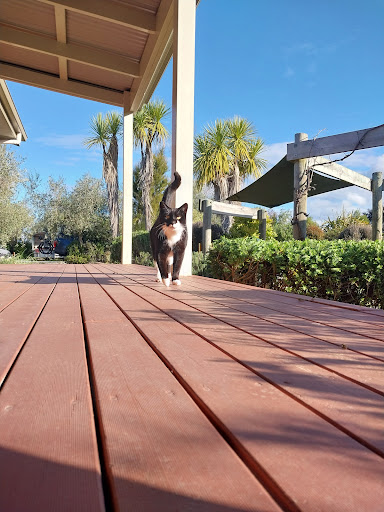 Stay here if you like peaceful views, friendly cats, and incredible, fresh breakfasts all at a good price. ||This was a wonderful respite, and I was welcomed immediately by Barbara. The rooms are comfortable and well-appointed, and the real magic is in the common areas. There is a well-organized, well-stocked, and clean kitchen for guests to use to prepare meals. Breakfast is included.|| And what a breakfast it is!! There are eggs fresh from the lodge's chickens; scones, breads, and muffins from their bakeshop; and local freshly delivered milk. Any extra pastries are available for snacking throughout the day. There's an old-school video arcade console with many games, a TV room with endless DVDs, a small library, a grill area, outdoor seating areas, all of it welcoming and with a view of the nearby hills and wandering pukeko. ||The staff are welcoming and thoughtful in answering questions, and the resident cat is around on the deck if you go looking and need a little cat fix as I did. (but if you don't like cats, don't worry. In typical cat fashion, he's not going to bother you if you don't want to be bothered!)||Eden's Edge is just outside Motueka. It's easy to find and a short, but peaceful distance from town. Thank you, Barbara and Minos, for making me...
