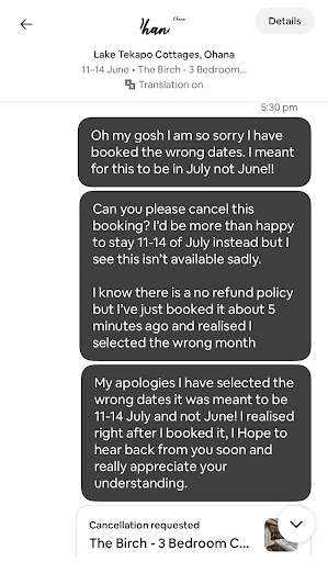 As myself and partner were planning a trip to NZâs South Island), I made the mistake of selecting the wrong dates to rent one of their properties. Instead of selecting 11-14 of July, I accidentally selected 11-14 of June. The cost of the 3 nights WAS $500 (AUD).