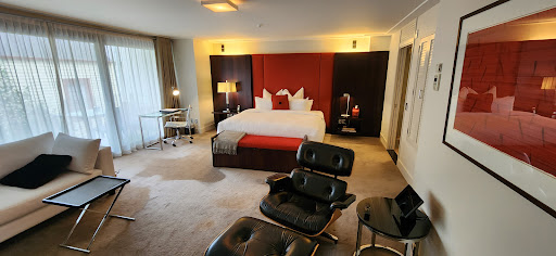 The rooms are spacious and luxurious - mid-century inspired - think Austin Powers with taste and a fire to boost! The balconies were large, with furniture for four to six people. The office desk and chair were extremely comfortable for the zooms and emails I did during our trip - this is usually NOT the case. More often than not, hotel study chairs and desks usually make my neck and back hurt! Attention to detail that I truly appreciate! The bathroom was spacious with a huge bath and a toilet with a door. Having a separate space for luggage was genius - keeping the girl mess out of the main room.