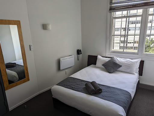 We were stuck in Auckland during flooding and the airport was closed and pretty much every hotel was booked solid, and this was the only place we could find with a room in the CBD....at $270USD for one night. Look, we were thrilled to have a bed within walking distance in a clean property but this was definitely price gouging (at least double normal price) for a property that was (or still is?) a former college dorm or similar, a little off the main path in the city. The place is about 10 minute uphill walk from the main streets downtown in a small and quiet little residential/dorm/ apartment area. You buzz in to the property and a guy behind a giant wrapped plexiglass window gives you a key to your room and a fob for the external entrance. In spite of the documentation indicating it was required, we did not have to leave a cash deposit. The property was clean and quiet with no real "hotel facilities" like food or business center. The room was also nice and clean with a refrigerator and microwave. The bed was up against a window which would not lock but was high enough off the ground to be a real security risk. Free WIFI worked good and free in room coffee was appreciated. The only really issue is that every room has an in-wall air conditioner, and in our room, the dehumidifier / condenser made loud sucking/ draining/ pumping sounds about every 30 minutes so definitely restless sleep. No food facilities at all or breakfast.