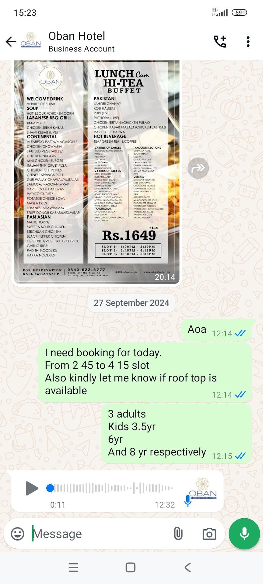 Ā Ā Ā Read moreReview about OBAN Hotel Highly pathetic service of Oban. Around 3 weeks back I reserved seats for hi tea for my family including kids on call. Some female staff assured me that the table was booked by my name but hi tea service would be served on table rather than self service. I again asked if all the dishes mentioned on the menu would be available. She said yes. Upon reaching restaurant half hour before the given time a guy told that there was no hi tea available. When I asked that I confirmed booking a few hours ago, the same female staff rushed towards me n told that hi tea would be served, there was some misunderstanding.i again asked if it's not available she should tell me then so that I can decide whether to stay or leave.she said it is available. After 20 minutes then guy came and told us that the female staff who reassured me about hi tea had left for her lunch and the other staff is unaware of any hi tea, we should opt for ala carte. I enquired him that why that female staff committed with me. He said that he has no idea why she committed so and she's not available now. I left that place immediately. I have the proofs of their voice note saying that hi tea was available If u ppl can't entertain him tea why don't u tell the customers at first place rather than wasting our time, kindly train your staff the basics Won't ever...