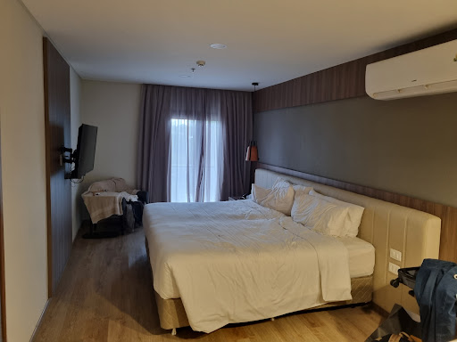 Located in a residential area, one of the nicest of Asuncion, surrounded by luscious green trees and next to the busiest shopping malls. It has a nice entrance with a stair of 9 steps (it does not have access for the disabled). Its strongest point is a beautiful modern and quite sophisticated design. Everything looks very new and very clean. It has a stylish lobby (it is in the style of the boutique hotels), the rooms are ample, luminous and with many high style deco details. Rooms and corridors smell wonderfully. Artificial lighting is very good. Beds are comfortable, pillows are very good. The minibar is well provided, there are also some few snacks. There is no coffee-machine (in spite of what is told in the booking websites, they do not have a gymn either what is also announced in the booking websites). No ironing board. There are several plugs with American type outlets. There is a large mirror. The bathroom is completely new, ample enough. The shower is huge but not very potent, water is hardly warm. The shower box has a beautiful porcelain floor, although a bit slippery and with not very good bars (older people to be cautious). They offer some amenities (no shower cap, no paper handkerchiefs). There is an augmentation mirror and a hair-dryer that works very well. Breakfast does not have a very wide selection but quality is very good. Internet connection is fine. Every single member of the staff is amazingly kind and attentive to all your possible needs. The rooftop is delightful with a charming pool and a very nice view. It sounds quite perfect, but it has some pitfalls that one assumes come from inexperience (the hotel looks new): in a country where many people may have concerns about the safety of tap water, they do not offer free water bottles. The beds are super King, but they have a light table only on one side. They have a quite wide selection of beverages in the minibar, but they do not have any glasses. And what I have never seen: bathroom has only one roll of toilet paper (none spare). In summary, a boutique hotel that is extremely nice and with good service. It compares favourably to many larger and more expensive hotels in Asuncion. If they improve some details it would be worth a quite higher price than they ask for now. Check-out is 10.00...