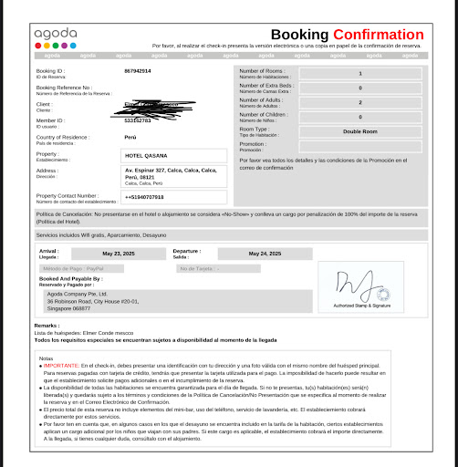 Read moreAdvertencia a futuros viajeros – Mala experiencia con el Hotel Qasana de Calca||Estuvimos tres días en la ciudad de Calca con una delegación de basquetbolistas, y todo el equipo se hospedó en el Hotel Qasana de Calca, ubicado en la Plaza de Armas (Av. Espinar 327, Calca). Toda mi familia y yo hicimos la reserva de forma anticipada a través de la plataforma Agoda, que mostraba disponibilidad y permitía el pago directo para dicho hotel.||Sin embargo, al presentarnos en el hotel, nos llevamos la desagradable sorpresa de que no reconocían nuestra reserva. Mostré el comprobante de pago y la confirmación de Agoda, pero su respuesta fue que no trabajan con esa plataforma y que debía esperar hasta el lunes para hablar con el responsable de reservas.||Volví el lunes como me indicaron, pero me informaron que el encargado no se presentó. Me proporcionaron un número de teléfono para enviar el código de reserva y me prometieron que revisarían el caso y procederían a la devolución del dinero. Han pasado varios días y solo he recibido excusas y evasivas.||Hoy, 5 de junio, volví a comunicarme con ellos, pero me respondieron de manera prepotente y nuevamente mencionaron que "consultarían con el encargado de redes", quien aparentemente nunca está disponible. Hasta ahora, no tengo solución ni reembolso.||Por todo ello, me siento en la responsabilidad de advertir a futuros viajeros: no reserven en este hotel a través de ninguna plataforma ni directamente, ya que no reconocen pagos realizados, no ofrecen soluciones y su atención al cliente deja mucho que desear. No hay profesionalismo ni...