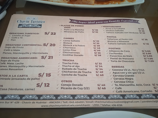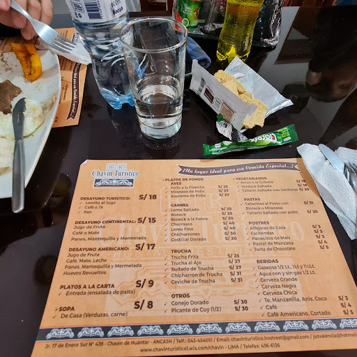 Read moreWe had dinner and breakfast at Hostal Restaurante Chavin Turistico. It wasn’t busy the night we went there and the service was good. Our waiter spoke only limited English and we speak only limited Spanish, but he was helpful and friendly. We split the huge Sopa de Pollo (very tasty and filling), then my Trucha al Ajo was really excellent … the trout was huge, perfectly cooked and fell right off the bones. I assume it was caught locally? Two rivers meet in Chavin so maybe it was from there. My wife liked her Lomo Saltado and sweet cookies for desert. The location is convenient … around the corner from the hostal, and short walking distance from the Chavin ruins. We also stayed at the hostal, which I am not reviewing here, although I can say that the three-floor hostal has a tiny gated courtyard with room for one car where we parked. No one is on staff there … you ring the doorbell and someone comes around the corner from the restaurant to let you in. We were the only people in the building that night. It was pretty good, but not outstanding like the trout dinner! In the morning, we walked over to get the Deseyuno Americano with fried egg, Peruvian flat bread & marmalade, juice and cafe con leche (they had to run to the store for milk and by the time they got back the coffee was not hot). However, we liked the restaurant, food and staff a lot. There is no wifi there and they...