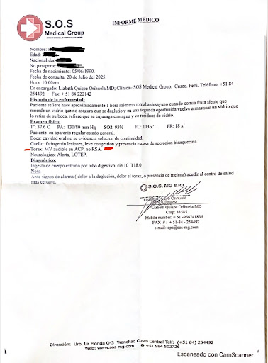 Problema extra : me dieron el original de la página del libro de reclamaciones en lugar de la copia (cosa que me parece rara, porque normalmente se debería dar la copia), el reporte médico que me dieron, incluía un resultado de tórax, sin haber auscultado con un estetoscopio durante la consulta, lo que nos hace dudar de la calidad de reporte médico que hemos recibido por parte de la doctora en el hotel.