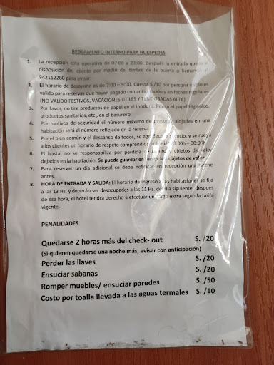 Read moreFuimos en pareja durante febrero, reservamos por internet y llegamos sin muchas expectativas (ya que las fotos no son muy buenas), sin embargo, el hotel es muy bueno, los chicos de la administración son muy amables y siempre dispuestos a ayudar. El hotel está comenzando, por lo que todo es nuevo o con muy poco uso, la cama es amplia y cómoda, al igual que la habitación que nos asignaron. ||||El hotel está situado a pocos pasos de un complejo termal conocido como “los baños de la meseta” entrada (5 soles) y por lo mismo, tienes movilización a la puerta. Puedes llegar caminando al centro de churín en pocos minutos, pero al regreso prefiere moto-taxi (3 soles la pareja). ||||Las cosas no tan buenas son: la mala señal de internet (se corta por las noches) y la falta de ascensor, por lo que tienes que estar bajando y subiendo...