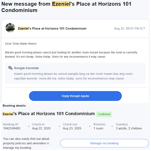 We traveled a long way, carrying lots of luggage and things, plus two small children โ it was not easy. Thatโs why we booked in advance, to secure a place to stay, but this is what happened.