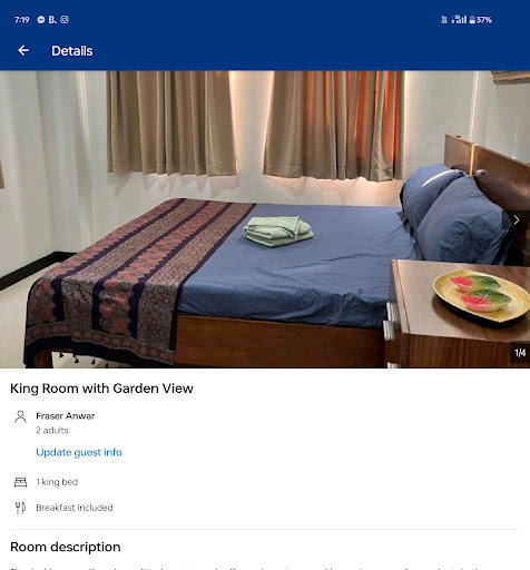 I booked a king sized suite which was supposed to be "5 min" from the airport. I get there after essentially riding 15-20 min past the airport in a back alleyway off-road to a dead end with no traffic. The owner sends us to a dilapidated room with a barely functional a/c, no TV and no amenities and bypasses me (the person who booked the room) to explain (not in English) to my fiance that they bumped my room that I booked months in advance down drastically in quality to favor a bunch of marines that casually came for a visit. They spoke english but was clearly avoiding accountability. They also refused to give a refund. This was on my fiances birthday. Inserted is a picture of proof of what I paid for. I didn't stay more than 5 min where they...