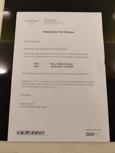 BUT the deduction in the stars, comes from the lack of timely communication by the hotel team on a facility closure - the temporary swimming pool closure. I cannot hide my disappointment at the untimely notice we received under our room door when we returned to our room in the evening. A pool closure on May 2 from 6am to 6pm due to a private event, to be reopened at 6:01pm. Part of going to the pool is enjoying it during the daytime. And to take it away from guests from 6am to 6pm, is very unfair.