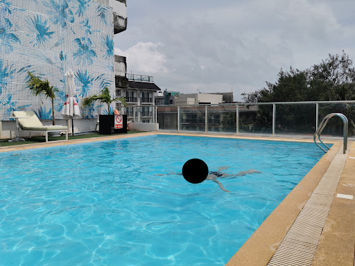 +Location. In the middle of 'D Mall' with many stores, supermarket and restaurants around. 100m walk to the beach. +Friendly and helpful staff. +Swimming pool, bar, restaurant, toilet and shower on top floor (3rd floor). +1 bath towel per person can be changed once per day. +Air condition (little noisy), Refrigerator, TV, good wi-fi. +Check in time is 14:00 (not 12:00 as in the booking confirmation), but we could get bath towels and stay at the swimming pool before we got the room. +Live music at night on top floor. +Can wash the feets at the entrance from all sand from the beach. +Water machine in the hall for drinking, also boiling water.