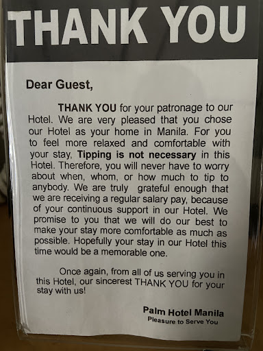 I normally enjoy staying in the Palm Hotel Manila but last 2 times in January and February of 2025 I started to notice some things were different and it mainly involves the staff. In January when I stayed there for approximately a week and a half they put me on the 10th floor and there was construction going on right above my room. The hotel wasn't full so not sure why they did that but it was very noisy and would wake me up early every morning. I also noticed some of the new staff, mainly at check in counter, were not very friendly and kind and actually talked to another person staying there who had been there many times and he felt the same way. Although some from the new staff were great and friendly and kind the others were more worried about being on their cell phones rather than doing their jobs. One of the new security guards would just sit there when I would go to the doors while the ones before always opened the door. I don't like writing bad reviews but one of the breaking points to make me write this was when I had 3 bags in my hands and was struggling to get the door open and the entire time the security guard sat there about 2 meters away just focusing on his cellphone. The second and final thing that made me write this review was on my last day there, after staying there 2 different times in a month for a total days of almost 2 weeks and spending a fortune there and always being kind and tipping the employees, was when I went to the check in counter and explained that my transportation wasn't going to be available until later in the evening and asking if I could have a late checkout of 2pm. I explained that the housekeeper normally didn't clean my room until around 3pm, which was fine, and that I wouldn't be delaying getting the room clean. The employee at the counter immediately got a negative attitude and showed me a sign saying that I could pay P1,900 and stay until 6pm. Mind you that I was paying approximately P2,150 for a normal day of 2pm-12pm. I wasn't happy but kept my calm and said ok I would just leave at 12pm. She then said she would talk to her manager about late checkout. I went down later to go to the store and as I was walking thru the lobby she gave me thumbs up 👍 and with bland look on her face and when I asked why she said her manager said I could stay until 2pm but she didn't seem happy about it I've stayed at that hotel dozens of times and never had any problems until the last 2 times but I don't know if I will go back or if I feel comfortable recommending it anymore. The staff that's good is the best but the staff that isn't good...