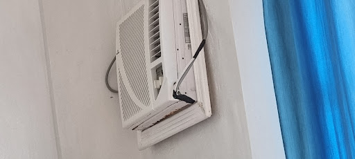 The air conditioning unit was far too small to cool the room adequately, and the main electrical wire was wrapped in layers of electrical tape—a clear safety concern. There were two electric fans provided, which might be useful for some, but I personally dislike them.