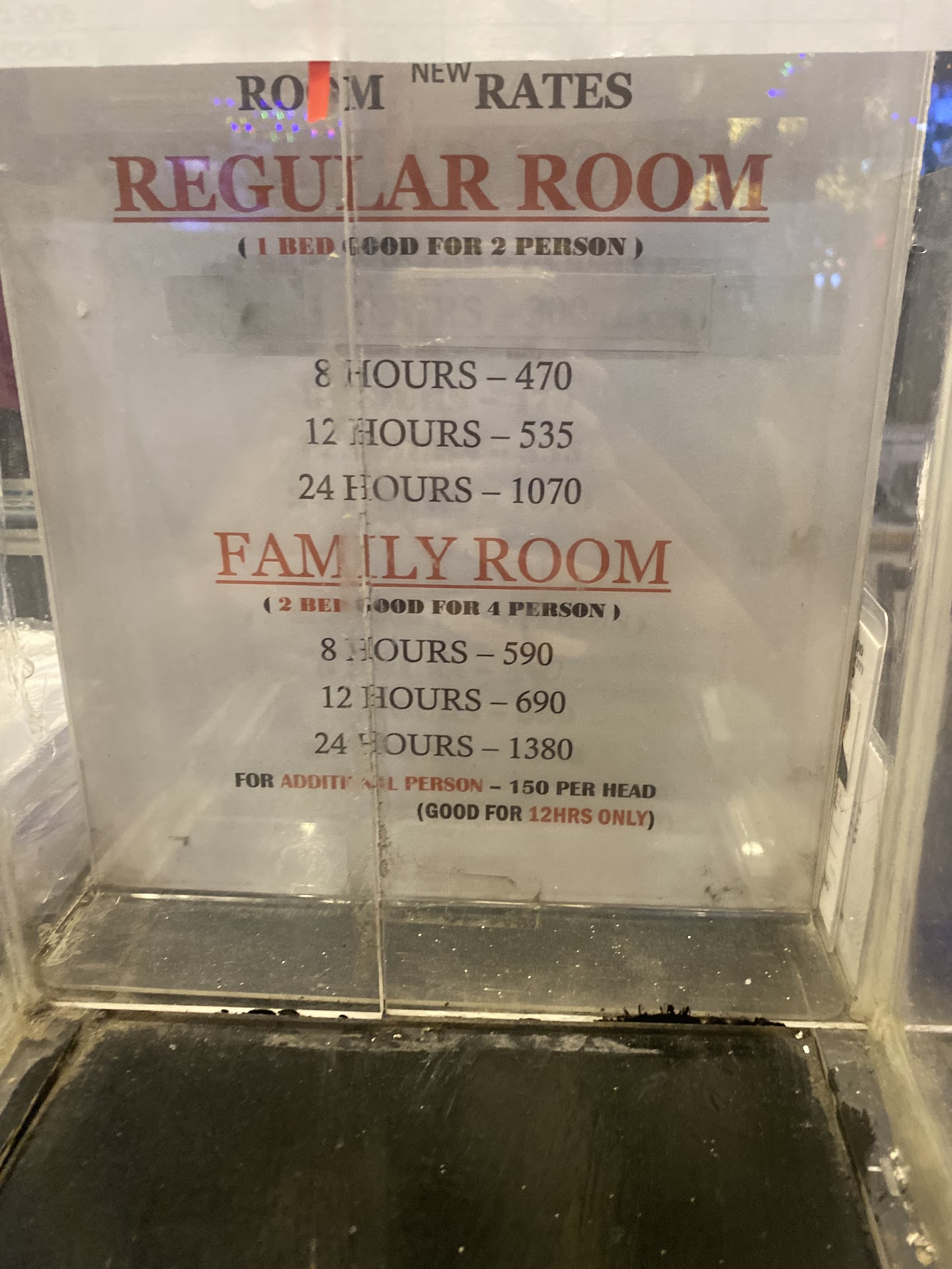 The hotel is like transit short time hotel for travellers by hour or 12hrs .Location is ok near SM mall but reat maybe affecting by the noise exhauat sound by rhino bus by road side. IT WALK IN and take queue number wait for room . Security of room.is also basic jus key hooked with tv remote . Dont forget to.lock the room when u leave the room. Ard this area it bigger already with a small food stall . And it beside shakey pizza restaurant for food choice . Plus it the few with proper car parking although like only less then ten lots it gd for those driving . However no lift access from carpark jus a small stairs .there small area where the they sell drinks However the room are basic cleaned . bed and lining is army quality abit stenched and toilet is basic a metre width . . Hotel condition is ok not too bad . Aircon is old and noisy . The room i got on 3rd floor toilet flush...