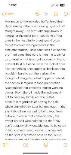 Moving on to the included buffet breakfast. Upon seeing it the first morning I got put off straight away. The staff although lovely in nature for the most part, (speaking of the ones in the hospitality area) would often forget to cover the ingredients in the omelette station, I saw countless flies on the pre-fried eggs that were left on the table for us to feast on (at least put a cover on top to prevent this) but once I saw the lack of care over something once again as basic as that, I couldn’t bare to eat there given the thought of imagining what happens behind the scenes in regard to food preparation. Also noticed that omelette-maker wore no gloves. From there I made the judgement not to have my family eat the buffet breakfast regardless of paying for it the whole stay already. Last but not least, in the event that if we wanted to bring food from outside to eat in that common area, the owner her self who pointed out that they don’t actually allow outside food to be eaten in that common area, made up a new rule on the spot it seems to have to fork out a “corkage” fee of $250php PER ITEM OR PER DRINK! Last I checked, the definition of corkage states: “a charge made by a restaurant or hotel for serving wine that has been brought in by a customer.” At times my other family who I forget to mention also stayed (some over 10 nights) paying over $35k php each family were having to fork out 1000-1500php for a fee that seemed to have been made up on the spot. We tried time and time again for consideration given that we had already spend large amounts of money as a family during our stay.