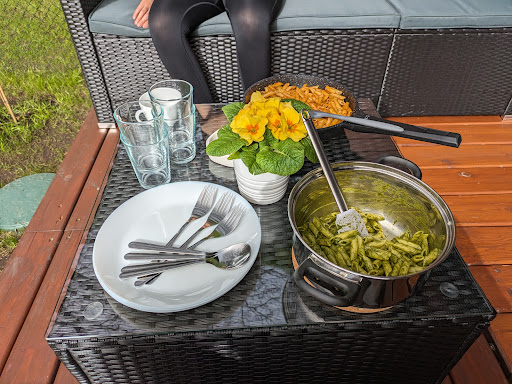 Domek jest faktycznie na skraju lasu - ostatni (albo pierwszy) w niewielkiej miejscowości nad jeziorem. Nowoczesny z pełnym wyposażeniem, bardzo dobrze utrzymany, wszystko działa bez zarzutu, internet jest. Na terenie posesji dostępne są różne rzeczy - grill, ognisko, stoły, leżaki, hamaki, nawet rowery - ze wszystkiego można korzystać. Największym jednak skarbem tego miejsca są jego gospodarze - absolutnie wyjątkowi ludzie, przemili, gościnni i bardzo zaangażowani. Czuliśmy się dobrze zaopiekowani w każdym momencie. Mimo, że niczego nie brakowało, to często interesowali się, czy czegoś nam nie trzeba, czy coś uzupełnić, czy wymienić ręczniki czy pościel. Dodatkowo to bardzo otwarci i towarzyscy ludzie, więc zawsze mogliśmy liczyć na miłą i ciekawą rozmowę, porady gdzie jeszcze warto pojechać, co zobaczyć, gdzie zajrzeć i jaka jest pasjonująca historia różnych miejsc w okolicy. I najważniejsze, że było to zupełnie naturalne, w żaden sposób nie wymuszone "pod turystów", bo na co dzień było widać jak wszyscy sąsiedzi tutaj odnoszą się do siebie, jak się wspierają. Wszystko to sprawiało, że czuliśmy się mile widziani, czuliśmy się po prostu dobrze. Dziękujemy, że choć przez chwilę mogliśmy być częścią tego wyjątkowego miejsca i wyjątkowej społeczności. To miejsce pozwala na nowo odnaleźć radość z tamtych lat dzieciństwa, gdy jeździło się na wakacje do babci na wieś. Aż chce się tu wracać.