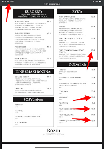 Wielkie rozczarowanie po systematycznym, półtorarocznym korzystaniu z Restauracji Rózin!!! TAK SIĘ TRACI STAŁYCH KLIENTÓW I ICH ZNAJOMYCH. Jako wieloletni przewodnik Google, z wielką przykrością piszę ten komentarz. Nikt nie lubi być rozliczany na niejasnych, nie ujętych w menu zasadach, gdy na dodatek personel restauracji z uporem wpiera mu, że tak było od zawsze. Nie było-sprawdziłem w historii płatności karty płatniczej! Jesteśmy stałymi klientami restauracji Rózin, którzy od 1 i 1/2 roku zawsze zamawiali sandacza w cieście piwnym i mix sałat wraz z frytkami belgijskimi lub chrupiącymi ziemniaczkami. Dokonaliśmy dzisiaj, zresztą jak to często bywało zmiany frytek belgijskich na chrupiące ziemniaczki (są w karcie w tej samej cenie) i oto dzisiaj pojawiła się nagle, z kapelusza (nigdzie nie ujęta w menu restauracji) cena 55,- zł. za sandacza solo, do której to ceny doliczono 15,- zł za ziemniaczki i 13,-zł za mix sałat. Reasumując zapłaciliśmy za jedną porcję 83,- zł. zamiast 65,- zł. I droga Szefowo, na którą dzisiaj wielokrotnie powoływał się personel - nie chodzi tutaj o ten zawyżony o kilkadziesiąt złotych rachunek, bo nie zbiednieliśmy zbytnio, tylko o zasadę! Niektórzy klienci potrafią jednak czytać i liczyć i nie godzą się na niejasne rachunki, które zawierają pozycję w ogóle nie ujęte w menu, bo cyt.„szefowa zatwierdziła personelowi na tablecie taki system”. Co z tego, że kelnerka, po zapłaceniu rachunku jednostronnie pokazuje klientowi na tablecie coś, co nie ma w żaden sposób odzwierciedlenia w karcie dań? Kuriozalne! Wszystko powinno być czytelnie i jasno ujęte w ogólnodostępnym menu - koniec, kropka. PROSILIŚMY O POKAZANIE W MENU CENY SOLO SANDACZA ZA 55,- ZŁ Z NASZEGO PARAGONU, DO KTÓREJ BYŁY DOLICZANE DODATKI I POWIEDZIANO NAM, ŻE W MENU JEJ NIE MA ALE JEST W SYSTEMIE NA TABLECIE, ZATWIERDZONYM PRZEZ SZEFOWĄ. Bywaliśmy u Państwa kilka razy w miesiącu i dlatego dzisiejsze rozliczenie wprawiło nas w dużą konsternację a wyjaśnienia personelu były żenujące. P.T. Szefowo - zyski, za wszelką cenę to nie jest wszystko ponieważ raz utraconej renomy nie można łatwo odzyskać, że o poinformowaniu o nieprzyjemnej sytuacji dużego grona znajomych, którym poleciliśmy Rózin nie wspomnę. Pomijam już zupełnie, że taki system liczenia, całkowicie spoza menu wydaje się być sprzeczny z obowiązującymi prawami konsumenta. Zatem zamiast pisania pod niniejszym komentarzem metodą kopiuj/wklej zdawkowych przeprosin i zapraszania na gratisową kawę, lub argumentacji, że czasy są ciężkie, ZUS i ceny rosną (faktycznie podnieśliście ostatnio ceny), jak to robicie pod innymi negatywnymi komentarzami o Waszej restauracji proszę łaskawie wpisać w menu faktyczne ceny ryb solo np. sandacza w cieście piwnym 55,- zł. jeżeli je chcecie stosować! Proszę wpisać także jasną i jednoznaczną informację, że do tych cen solo należy doliczyć cenę sałatki i np. chrupiących ziemniaczków oraz że cena ryb ujęta w karcie jest, wraz z wyszczególnionymi tam dodatkami WYBITNIE PROMOCYJNA (nie ma tam ani napisu zestaw, ani zestaw promocyjny). Brak również w menu informacji, że nie wolno klientom finansowo bezkarnie podmieniać niektórych składników-będących nawet w tej samej cenie. np. dla sandacza frytek belgijskich na chrupiące ziemniaczki. Obecny opis dań z ryb, zawarty w menu jest całkowicie mylący i może wprowadzać w błąd konsumentów, narażając ich na dodatkowe, nie ujawnione w karcie dań koszty. Może się mylę ale wygląda to na celowe działanie ponieważ dodatki są opisane jako do wyboru, cytat z menu „ podawany z frytkami i surówką do wyboru” co sugeruje, że dodatki można bez zmiany ceny zamieniać, tym bardziej, że poniżej figurują w menu dokładnie w tych samych cenach. Powtórzę jeszcze raz, nie chodzi tu o te kilkadziesiąt złotych a o zasadę i przejrzystość informacji dla klientów. Szkoda, że takie klimatyczne miejsce tak traktuje klientów i działa w taki sposób! Mam szczerą nadzieję, że Szefowa będzie uprzejma to raz na zawsze uporządkować, aby nie zrażać niejasnymi zasadami rozliczeń starych oraz nowych klientów. Z wyrazami...