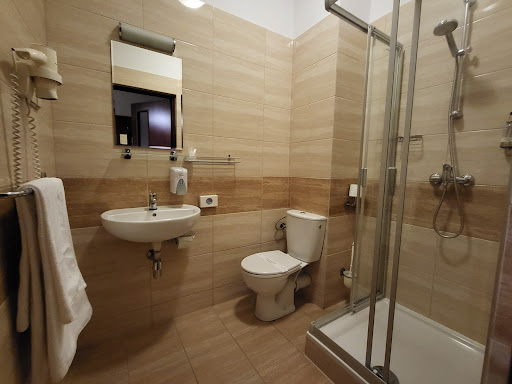 I reserved two rooms for a family trip to attend a Christening. Although I booked a double and a single ,the hotel was kind enough to allocate two double rooms adjacent to each other for our convenience. The location is quiet and convenient to walk to the nearby shopping centre. The check in staff were very pleasant and extremely efficient, and it's always nice to see smiling faces when you first arrive.We were on the first floor and it was noticed that the hallways were lit but were still a little dark especially if your are of poor eyesight. The rooms were very clean and tidy but lacked any luxury furniture, for example, a comfortable arm chair would have been nice.. The bed was quite low to the floor and set in a wooden frame on all sides, however the mattress was reasonably comfortable but the duvet seemed like it was a little small for the double bed.The bathroom was very smart with good quality tiling and the shower worked very well. The shower was encased with two sliding doors which may give you a problem squeezing between them if you are a large person. Toiletries were standard and no plug fitted to the basin. There is no coffee machine,iron or ironing board in the room and the hotel instructions state that it is forbidden to take them into the hotel for safety reasons. The breakfast served on the ground floor was very nice and was typical of Polish tastes,sliced meat,cheese ,frankfurters and fried eggs,nice food with many accompaniments,salad ,toast etc. All in all a nice stay but...