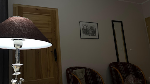 Sam pokój- brak słów, wąski pokój, z zaparowanym od wewnątrz oknem (pokój nr 3). Jedna mała szafa z 3 wieszakami, nie było nawet miejsca, żeby się rozpakowac. Brak miejsca na kurtki. W łazience brak płytek, tylko białe ściany. Bez wentylacji. Parking nieogrodzony.