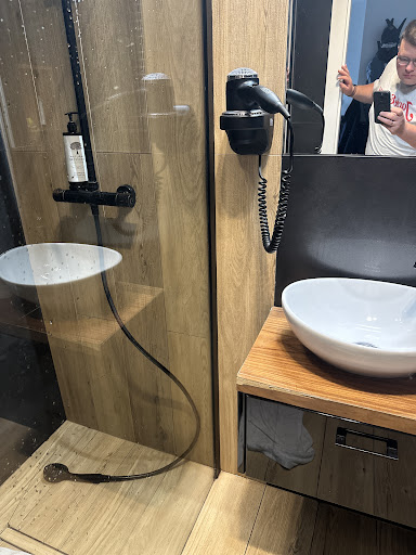Badezimmer: Man sitzt quer auf dem Klo. Blöd gebaut. Duschkopf Halterung ist abgebrochen und die schwarzen armaturen sind nicht mehr schwarz....... Das Gefälle der Fliesen in der Dusche stimmt nicht, so daß die türzage Auf quillt. Wasser läuft Richtung Flur. Unter dem runden Waschbecken ist eine holz Platte. Die verträgt sich auch nicht mit Wasser! Irgendjemand war so ärgerlich darüber das er die Tür eingetreten hat. Da drüber klebt ein Zettel.