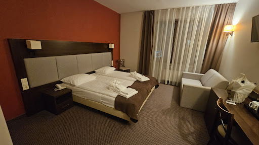 I was really disappointed when I left the hotel. After spending 5 days here I definitely think it wasn't worth it. Although Sandomierz is very beautiful the journey back and forth from the hotel to the old town without a car can be quite exhausting, as the distance is 800m. Not to mention how many times you have to go up and down hill. You can rent bikes in the hotel, so I guess that is a plus. The hotel room seemed farely clean, apart from the hair stuck in the drain from when a different guest was occupying the room and the big splater of blood on the curtains. I'm guessing some killed a bug there, but it's still disgusting to have a blood splater on your curtain. The cleaner ladies were very nice and helpful, although it seemed like they weren't properly educated and trained, as they didn't take care of the two problems I listed previously. The restaurant during breakfast was mostly packed between 8-10. There was very little tables for two, and too many big tables for eight. The waiters that worked during the breakfast were clearly inexperienced and seemed to have trouble dealing with all the tables. The utensils and all the dishes were not washed properly, often with visible leftovers from the last time someone used them. You had to very carefully pick out your plates to not get a surprise with your breakfast. The restaurant itself was often empty during dinner hours. I ate there twice during my stay, the food was surprisingly good and completely blew my expectations. The waitresses that worked in the restaurant during dinner hours were farely nice and helpful, and seemed to at least have an idea of what they were doing. The balcony attached to the lux rooms was accessible by all of the hotel guests, leaving you with little privacy when you had your windows open. The construction of the walls made it possible to hear some noises from the room next to you and the thing that bothered me the most is how you can basically hear everything that's going on outside in the hallway. People screaming, shouting and the loud doors. And I leave the one thing I was satisfied with for the last. The only thing that this hotel seemed to get right was hiring receptionists. The ladies that worked there were extremely nice and helpful, always tried their best to help you solve your problem. They were very professional and I'd say that they should get a medal for their work. Over all, this hotel isn't a train wreck, but it's not doing it's best. I'd come to Sandomierz again, but definitely not to this place. Hire some new staff, then...