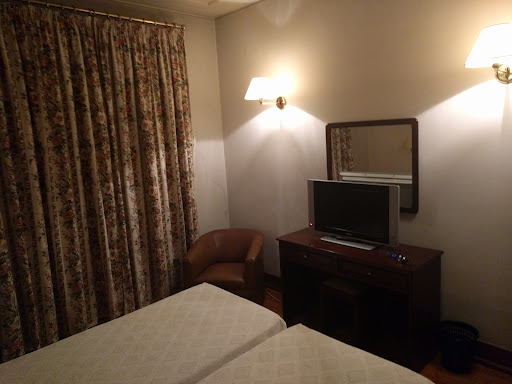 Imagine yourself in the roar of the 50s, alighting at the station of Coimbra, and finding yourself in a neighbourhood of modern hotels, flashing lights, and an overall welcoming environment. Right next to the station, you have Hotel Bragança, at the time probably considered sky-high. You climb the steps, and you walk in a hall decorated in a sober but elegant manner, with a lounge filled with people smoking cigars in their leather chairs. You go up to your room, to find elegant iron beds and a large bathtub, where you can rest for a while before facing the brouhaha of the student city.||||That might have been it, half a century ago. Now, Hotel Bragança stands right next to the decay of an abandoned building, facing another hotel that, though it was certainly vibrant at the time, now looks like it has been closed for over three decades.||||Hotel Bragança itself, still hosting, seems to have stopped in time. The three stars it boasts will surprise you -- currently, it has the comfort of a regular bed and breakfast, no fancy extras, nothing extravagant, down to the basics. But the building might gain your sympathy for being authentically old and not fashionably retro.||||It is perfectly fine if you are, like I was during my stay, just looking for a place not too expensive to spend a night on your way elsewhere. The rooms are clean, they give you a small bar of soap, the breakfast is nothing special (but then again, people have been spoilt when it comes to hotel breakfasts and tend to expect everything, from scrambled eggs to caviar), the internet access is still done through a public desktop at the common room, all extras (like the toothbrush you forgot) are paid. A major plus: the view is great and the windows open! I don’t know about you, but it exasperates me when, to prevent you from smoking or from wanting to fly, I don’t know, the windows are locked tight at hotels.||||And you can still rest for a while before facing the brouhaha of the...