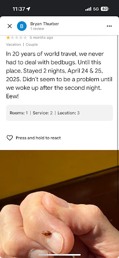 But don't just take my word for it. Look through other reviews that excoriate them for a long list of transgressions from hosting bed bugs to refusing to give a refund to someone who missed an arrival due to an urgent hospitalization of a family member. Apparently, they show more compassion to a homeless bedbug...