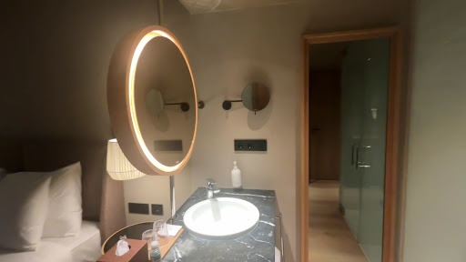 The room. Well sized. The bed is a bit near the sink space but it leaves some space for a table and two seats by the window which I appreciated to get my coffee in the room. The bed is comfortable. The bathroom is open to the room but it was fine because otherwise the room will feel tiny. Weird thing is that the toilet has a glass see through door. It has some designs but you can still everything inside, for the shower it’s fine but for the toilet it should have been different. I loved the fact that the curtains are automatically controlled and there are blackout switches that shut down all the lights and close the curtains. Another thing that I found strange is that among the 6 coffee capsules they put in the room 3 are complimentary and 3 are paid (1.5€ each) for one night it’s fine but for a longer stay it doesn’t seem right.