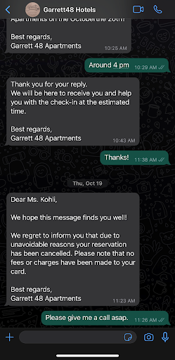 However less than 24 hours before check-in I received another text that "due to unavoidable circumstances" my reservation had been cancelled. I tried to text and call them over 20 times and no answer and still have yet to receive any further communication from them.