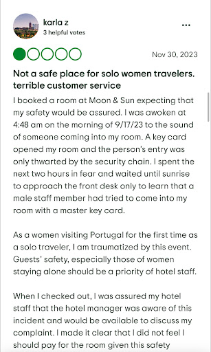 Read moreSERIOUS SAFETY CONCERNS - Hotel Moon & Sun, Portugal|1/5 Stars - DO NOT STAY HERE||Date of Incident: July 3, 2025||I am compelled to share this experience as a warning to other travelers, particularly solo female guests. What happened to me at Hotel Moon & Sun represents a fundamental failure of basic hotel security protocols that put guests in genuine danger.||The incident:|At 3:30 AM on July 3rd, while sleeping in my hotel room, I was awakened by the sound of someone attempting to enter my room using a key. I reached the door just in time to prevent it from opening fully. When I called out "who is there," the response was merely "I'm sorry, wrong room" with no explanation or follow-up from management that night.||Critical Security Failures:|This hotel has no peepholes in room doors and no interior safety locks that guests can engage - meaning once someone has a key to your room, you have no way to secure yourself inside. Despite having a "Do Not Disturb" sign posted, staff entered anyway in the middle of the night.||Most Disturbing: THIS HAS HAPPENED BEFORE|During my research after this incident, I discovered that an identical situation occurred to another female guest in September 2023. The fact that this exact scenario has repeated itself raises serious questions about the hotel's commitment to guest safety and whether these are truly "accidents."||Management's Inadequate Response||The hotel's explanation was that their system had "rolled over" at midnight, showing my occupied room as available for a new check-in at 3:20 AM. They claim staff was simply "inspecting" the room before assigning it to the new guest.||This explanation is deeply troubling for several reasons:|• No proper verification procedures before entering occupied rooms|• No protocol for handling late-night check-ins safely|• No apology or accountability for the trauma caused|• No immediate policy changes implemented to prevent recurrence||Ongoing Issues:||Weeks later, I am still fighting for a refund while management deflects responsibility and delays resolution. The manager actually suggested that my request for appropriate compensation was somehow unreasonable, despite acknowledging their system failure put me in danger.||WARNING TO FUTURE GUESTS||If you stay here, understand that:||• Staff may enter your room unannounced in the middle of the night|• You have no way to secure your room from the inside|• The hotel's booking system apparently cannot distinguish between occupied and available rooms|• Management prioritizes protecting their reputation over guest safety||This is not just poor service - this is a safety issue that could have escalated into something far worse. The fact that it has happened to multiple female guests suggests a pattern of negligence that makes this hotel unsafe for any travelers.||Stay elsewhere. Your safety is worth more than...