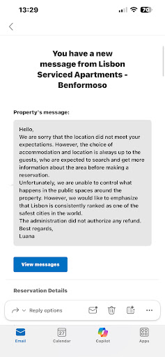 Our driver had to wait for us to safely enter the building because of how unsafe it felt. During check-out, a person came to confirm we had left — along with a cleaning lady — because they had already booked the same place again! I was told I would be refunded for the remaining nights. But when I contacted the property, they apologized and claimed they cannot control what happens in public spaces around the property — and therefore, I would not be refunded.