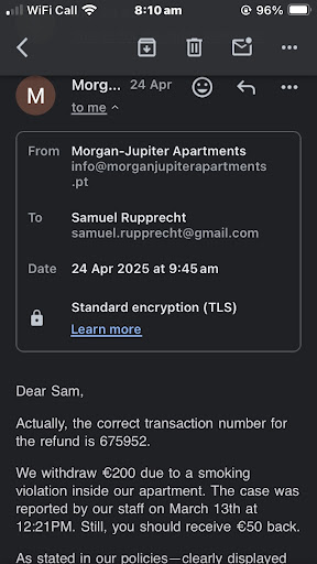 Of course, you refunded the tourist tax and deposit—that’s a legal requirement, not goodwill. Marking us as a no-show is not at all mandatory under Portuguese law nor SEF reporting, and only made it harder to seek proper resolution. The 15% compensation was issued by Booking.com, not by you, and does again not at all reflect fair goodwill given the situation. We are now forced to continue with...