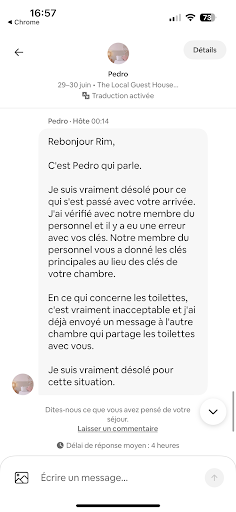 Read moreLoué sur Airbnb Par où commencer, Mon frère a récupèré les clefs clés vers 17h puisqu’à partir de 18h il faut rajouter 20 euros haha aucune information lui a été donnée pour le numéro de chambre car oui c’est des chambres avec la salle de bain et cuisine communes. Arriver vers 22h on arrive au logement avec plusieurs numéros de chambre on tente d’ouvrir la première l chambre s’ouvre et là je découvre une petite chambre qui ne correspond pas aux photos un lit simple et un lit double j’ai contacté le proprio il m’a demandé s’il on a eu des informations je lui ai répondu que non il m’a dit que c’était l chambre 3 on tente d’ouvrir la chambre bingo ça s’ouvre également !! Bonjour la sécurité La salle de bain était très salle, la chambre donne sur une rue principale donc bruit +++ J’ai demandé un remboursement partiel pour ce calvaire qu’on a eu avec mes parents et mon frère heureusement qu’on a notre avion à 4h du matin. J’ai fait un recours sur l’application airbnb il a refusé et il ose me mettre un commentaire en détournant les faits. Je ne vais pas lâcher...