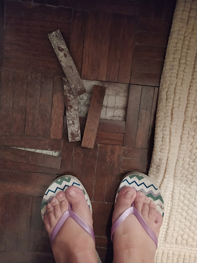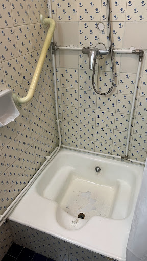 O quarto de banho é insólito. nota-se que houve obras recentes, porque a há marcas de tinta no chão em diversos locais e a tubagem da água quente circula pelo exterior da parede. Mas o mais estranho e até não sei até que ponto legal, é a presença de um cilindro no quarto de banho. O chuveiro tem uma pressão interessante, contudo o suporte não tem força para segurar o chuveiro o que faz com que tenhamos que o segurar com a mão. E com o aproximar do fim da reserva de água quente fica difícil de tomar banho. Além dos evidentes problemas de humidade pela deficiente ventilação do quarto de banho, a limpeza das condutas é algo que não foi tida em conta há muito tempo e mesmo a limpeza do chão deixou muito a desejar, já que vi vários cabelos brancos no chão, que não são meus.