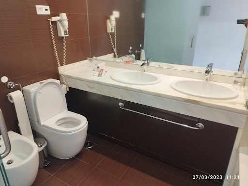 I never really liked the bathroom. The door is a slide door, and it's unlockable. Plus there's gaps so you can peak through. Amenities include a hair dryer and an uncommonly found French bidet. There are two large wash basins which are just unnecessary. The faucet is too far away so you have to bend over to reach the water. The tub is very narrow, and may be difficult for a large person. The shower runs hot and has good pressure.