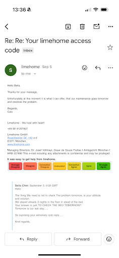My colleague and I left immediately and booked another hotel. Out of our own pocket. And the fact that Limehome dares to call this “hosting with heart” is just insulting.
