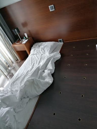 El buffet era pésimo. En Booking vimos reseñas y fotos de gente que decía que había mermelada caseras y se veía comida de otra calidad (mejor). Uno de los días los huevos eran incomibles, el camarero los probó y reconoció que quizás estaban "poco hechos" procediendo a retirarlos... Nada parecido a lo visto en las fotos de booking cuando llegamos allí. Al llegar había servicios de pago que no coincidían con lo visto en booking, como la caja fuerte. Lo reclamamos en el hotel y nos dejaron la caja fuerte incluida en el precio que ya habíamos pagado. Tuvimos que comprar unas pinzas para cerrar las cortinas (llenas de agujeros) porque por la mañana entraba toda la luz. El hotel es ruidoso porque está al lado de una de las carreteras más concurridas con estupendas vistas a torretas de la luz. El aparcamiento solo es apto para los más valientes y coches con potencia y buen embrague. Por defecto tienes pocas toallas y si eres un poco grande, no te llega ni para un pie. En Booking ponía que disponías de gel y champú y solo había un líquido verde 3 en 1 de aspecto sospechoso. La bañera es para matarte. Tuvimos que poner una de las toallas dentro de la ducha porque no había ningún tipo de antideslizante. La nevera es ridícula y no enfría. Nos la tuvieron que cambiar. El aire acondicionado es además una estupenda lámpara porque los leds iluminan toda la habitación. Compensa con las bombillas de bajo consumo de luz triste que hay en la habitación y el baño. El plano de emergencia también hace de linterna porque es fluorescente y para remate resulta imposible leerlo de lo pequeño que está. De nuestros 11 días de alojamiento, teníamos una colcha a los pies de la cama que al tercer día simplemente...