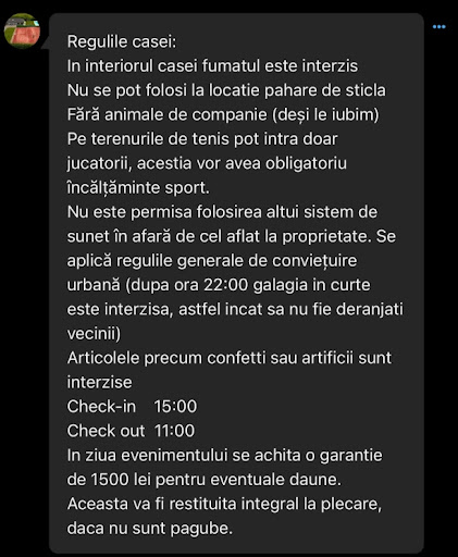 În regulile casei, pe care le-am acceptat și pe care le pot prezenta aici, nu este menționat nimic despre închirierea separată a terenurilor de tenis, așa cum ați specificat în comentariul de mai sus. De aceea, consider că dumneavoastră ați fost lipsită de onestitate.