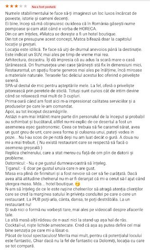 Read moreMatca, which means Queen Bee in Romanian, is located on top of a mountain near Brasov, Transylvania. It reminds me in many ways of the fabulous resort Blackberry Mountain. It just opened in January and the website doesn't do it justice.||We are staying in one of the Villas, which is very spacious and decorated with artwork made from pressed flowers. The bathroom is incredible with a shower that turns on with a push of a button and mirrors that light up and defog. There is a jacuzzi on the balcony perched over an incredible view down the valley.||The spa is world-class with an indoor swimming pool that has fountains on one side, a dry sauna, a wet sauna, a cold plunge and something I have never seen before- a salt room, which I hope will help my allergies.||The fitness room rivals most gyms and also has incredible views.||The attention is detail in the restaurant is remarkable. From the flatware and handmade plates and bowls to the bee motif that is subtly woven through the property. The food is great too.||This is a true luxury property in a very special part...