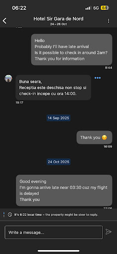 Read moreI arrived in the middle of the night, and the reception told that they have no room for me or nether the cleaner to prepare in the case the hotel will have free room. I wrote the message about my late arriving ON 10 OF SEPTEMBER!! And the answer was: “Buna seara, Receptia este deschisa non stop si check-in incepe cu ora 14:00.” For non native speakers “Good evening, The reception is open 24 hours a day and check-in starts at 2:00 PM.” So now you gonna explain why I need to wait for any room in the middle of the night or ether reception need to prepare that for me? And SECOND what does it mean the way of your communication with the quests? My name and surname was in the list, so you gave the same room twice? The first that I heard on reception was “we don’t have a room”, she even didn’t ask about booking, after my answer that I’ve made a booking WEEKS ago, I got “doesn’t meter, we gave it to someone else, because we don’t do check in at nights”, but I wrote about it and ask on 10th of September and also in the airport before arriving. SO WHY MY BOOKING WAS NOT CANCELLED AT 6pm or 8pm???? but after my arriving around 4am. I saw there are a lot comments like...