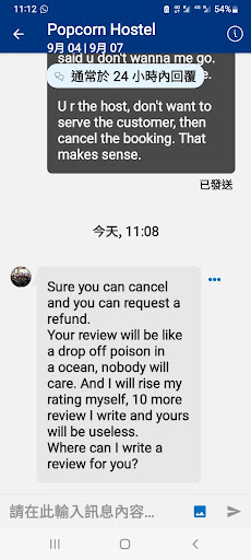 I booked a 3 days popcorn hostel in Romania on the platform of booking.com. But after I made the reservation, I immediately received a rude treatment from the hostel owner: where is your id? Read the first message correctly! Do you know what is automatic check-in? Did you read the "whole" message? (Ten pages in one min.) I don't know exactly what he's talking about, and then I ask him if I'm not welcome? Can he cancelled if not welcome. He said: You won't ask this kind of question after you read it!!! I want to say who provokes who~ Pay to fight. I just said: You are very rude, I am not welcome, you can cancel... Him: Are you illiterate? No cancellation required. In Romania I have the right to call the police , not let you into the dorm , no refunds , just because I don't think you are good enough to stay in my hostel . You can write bad reviews, but where should I write your reviews to you? Your evaluation will sink into the sea! Because I will write a dozen or 20 evaluations for myself, and no one will pay attention to your evaluation! Come on, I'll give you an evaluation when you come. Then I reported to booking.com that in their policy rules it says anti-fraud, intimidation and invasion of privacy, they will stop or cancel the booking. But I told them many times that it was five days and four nights, and they only paid me back half a day's stay, and they said that the hotel would not cancel, so they couldn't pay me back. But their policy says above: they have" the right "to cancel and stop threatening scams.