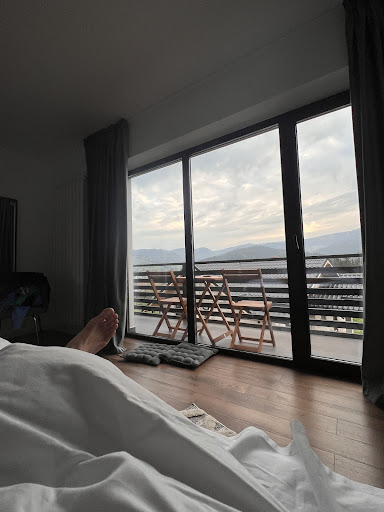 Bucătăria este complet utilată, inclusiv cu expresor de cafea, ceea ce a adăugat un plus de confort dimineților noastre. Camera 4 ne-a cucerit prin geamurile mari și priveliștea superbă către munți – un tablou viu, care încântă atât dimineața, cât și seara.