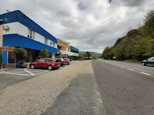 We were driving from Ramnicu Valcea to Sibiu, and it struck us that although we were a few hundred metres from the famous Olt River, we couldn't see the river and there seemed to be no access to the river bank, where we might have a drink or a coffee overlooking the water. Several times we turned down side streets in the direction where we knew the river had to be, and each time, we ended up in a parking lot, or locals assured us that there was no access. What! Is the river a secret? Anyway, after driving a few kilometres north from Ramnicu Valcea, we caught sight of the river, and by chance there was a small and unprepossessing hotel called the Blue River, where we could see a terrace overlooking the water. So, although we can't report on the rooms, we can say that this is a perfectly good place to pull off the road and have a quiet drink or a snack. It doesn't have the crowds that throng Caciulata, the more famous resort further north; there's a nice view of the river, a little bit veiled by the trees; the terrace is pleasantly landscaped, on several levels; and from time to time you can see, on the opposite bank, the passage of the little train that plies between Ramnicu Valcea and Sibiu....