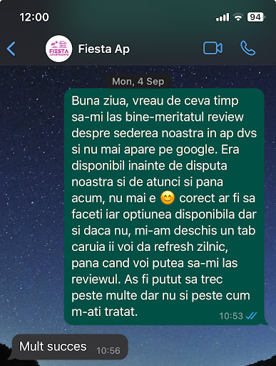 Read moreAm stat in acest apartament mizer 5 nopti, in vara anului 2023, timp in care am avut multiple probleme. In primul rand am intrat in apartament dupa vreo ora jumatate post check in pe motiv ca nu era curatenia gata, ne-am descaltat si dupa cativa pasi, aveam toti talpile negre. Fratiorul meu s-a urcat direct in pat si a murdarit cearceaful. Nu am avut un set de pat in plus, prosoapele au fost cate unul de persoana si atat, detergentul de vase era diluat la maxim cu apa, mopul era absolut dezgustator si mirosea a ud, in baie mirosea a sulf (ca in restul judetului), am avut doar doua suluri de hartie igienica si dupa ce l-am sunat pe stimatul domn sa-i spun ce nevoi avem, ne-a spus ca: (si citez) “stie ca mai mergea un mop-doua, dar s-a grabit sa ne lase in apartament”, in conditiile in care deja asteptasem mult si puteam sa mai asteptam cat era nevoie incat sa fie podelele curate. La telefon a urlat la mine din toti plamanii si la un moment dat mi-a spus ca nu ne intelegem si ca sa ii dau un barbat la telefon cu care sa vorbeasca. Tatal meu era plecat atunci si era decat fratiorul meu de 13 ani cu mine. I-am spus ca pot sa i-l dau pe el la telefon, ca poate pentru un baiat de 13 ani are mai mult respect. Mi-a inchis telefonul in nas pana la urma in timp ce continua sa tipe la mine. Intrebarea mea este: daca calatoream singura si nu ne intelegeam, cum reuseam sa comunicam pana la urma? Bogdan (proprietarul in cauza) este un pusti misogin de bani gata (nu pot sa-l numesc barbat) care nu stie sa faca turism sau customer service si nici nu cred ca ar vrea sa invete vreodata. Din vara si pana acum a anulat optiunea de a lasa un review, pentru ca stia ca abia astept sa impartasesc aceasta experienta extrem de neplacuta. I-am spus ca mi-am deschis un tab in browser caruia ii voi da refresh pana la sfarsitul zilelor mele daca e nevoie si iata ca a sosit ziua cea mare :) In concluzie: NU TOLEREZ MISOGINISMUL SI NU VOI ACCEPTA NICIODATA SA FIU TRATATA ASA, MAI ALES...