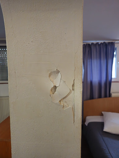 Read moreConditii EXECRABILE si atitudine de 2 lei, nu de valoarea pe care am platit-o! Ne-am cazat pentru o noapte pe 29.12.2024, venind special pentru targul de Craciun de la o distanta de aprox 250 km de Craiova. Am facut rezervarea telefonic cu o saptamana inainte si am sunat cu o zi inainte pentru confirmarea sosirii, asa cum am agreat cu persoana de la receptie. In ambele discutii telefonice am specificat ca suntem 2 adulti, un bebelus si un copil foarte mic, motiv pentru care am solicitat camera cu 2 paturi duble. Ni s-a confirmat ca vom primi un "apartament" si am primit camera 14 care era formata din 2 incaperi nedecomandate, avand un pat dublu si 2 paturi single. Am ajuns la cazare in jurul orelor 17:00 si nu mai era timp de cautat altceva si in zona nimic nu era disponibil, asa ca am decis sa ramanem la rezervarea facuta. Conditiile au fost cu mult sub asteptarile unor parinti care au crezut ca vor primi macar ceva decent si curat, avand in vedere ca am tot repetat despre prezenta celor 2 copii foarte mici. Detaliez ce am gasit in "apartament" si pentru confirmarea celor spuse atasez si fotografii. aerul in camera inchis si amestecat cu un soi de odorizant care probabil se dorea sa schimbe ceva, dar sigur schimbarea nu era una in bine; peretii loviti, juliti si murdari (pete evidente de murdarie) in multiple zone cand priveai de jos pana sus; peretele arcadei de la trecerea dintre cele 2 camere era nu numai murdar, ci si efectiv lovit/gaurit de ceva foarte tare in partea de sus(arata de parca se batuse cineva inainte acolo), zidul era crapat/gaurit, vedeti foto; tavanul in ambele camere avea pete semn ca fusese ud de la ploaie ori inundat de ceva de deasupra si acele pete erau fix langa instalatia electrica; in ambele camere era cate un bec, atat, nici macar o aplica/lustra; prizele mizerabile si se miscau din pereti in ambele camere; lenjeriile murdare sau cel putin necuratate corespunzator (ca sa ma exprim decent), in patul dublu era in partea de sus, sub perna o ditamai pata, parea pata uleioasa; paturile/pilotele/chestiile de invelit nici macar nu erau imbracate in cearsafuri si aratau uzate, luceau la colturi de la utilizarea intensiva fara a fi dezinfectate; mobilierul vechi, murdar si lipicios pe exterior(in interior nici nu ne-am uitat), julit si crapat la toate colturile; deasupra celor 2 paturi single era o placa ce voia sa para tablou si care era ciobit in multe locuri, semn ca anterior a cazut probabil, am avut multe emotii legate de siguranta ancorarii acestuia in perete; ferestrele si pervazurile infecte; in incaperea pentru toaleta... toate corpurile sanitare erau vechi si uzate, dar cada era efectiv ruginita la colturi pe exterior si aproape dezasamblata la toate colturile... si numai igienizata nu arata. La orice coltisor si imbinare din baie era igrasie/mucegai/mizerie. In baie era o ferestra mica ce dadea pe o coloana de aerisire sau ceva de genul acesta, oricum nu venea aer curat... cand ne-am cazat am gasit-o deschisa si am lasat-o asa si am iesit in oras, la intoarcere mirosea numai a fum de tigara in baie, miros venit de pe respectiva coloana; Acestea sunt cele mai importante nereguli observate si ne-ar fi placut sa fim informati pentru a putea decide daca acceptam sa platim pentru astfel de conditii sau nu. Am platit 300 lei pentru aceasta noapte si nu s-a pus problema de pret in niciun moment, dar inacceptabil este ca nu am fost informati si ca ne-am bazat pe niste fotografii din alte camere probabil sau din alta "viata" a pensiunii de 3 stele. La alte recenzii proprietarul a raspuns in urma cu fix 2 zile ca unele camere erau renovate si in altele doar ce s-a inceput renovarea. Ei bine, in camera 14 nu s-a facut nimic si e jalnica. Cand am platit i-am spus angajatei de la receptie feedbackul nostru si replica primita a constat in faptul ca nu toate camerele sunt renovate si ca nu ni s-a zis? I-am zis ca nu, ne-a privit urat si atat. Nici macar sa isi ceara scuze, sa empatizeze cumva cu noi, nimic. Incasase deja banii si nu mai...